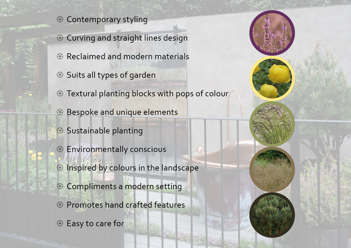 Inspired by my award winning show balcony with ssh scapes at the RHS Chelsea Flower Show in 2025, the Contemporary Landscape style brings the beauty of a landscape to modern setting.